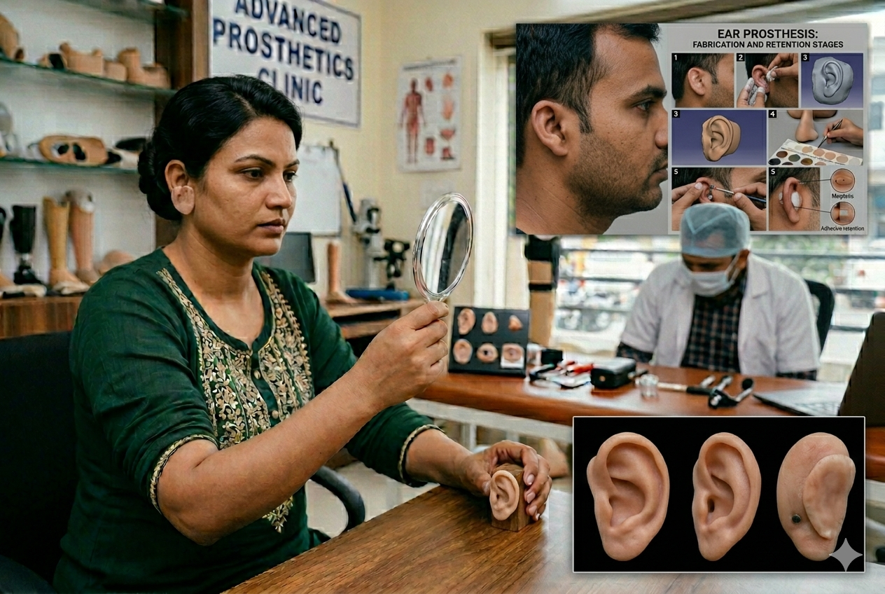 An ear prosthesis is an artificial replacement for a missing or deformed ear, commonly required due to trauma, congenital conditions, or post-surgical reconstruction.